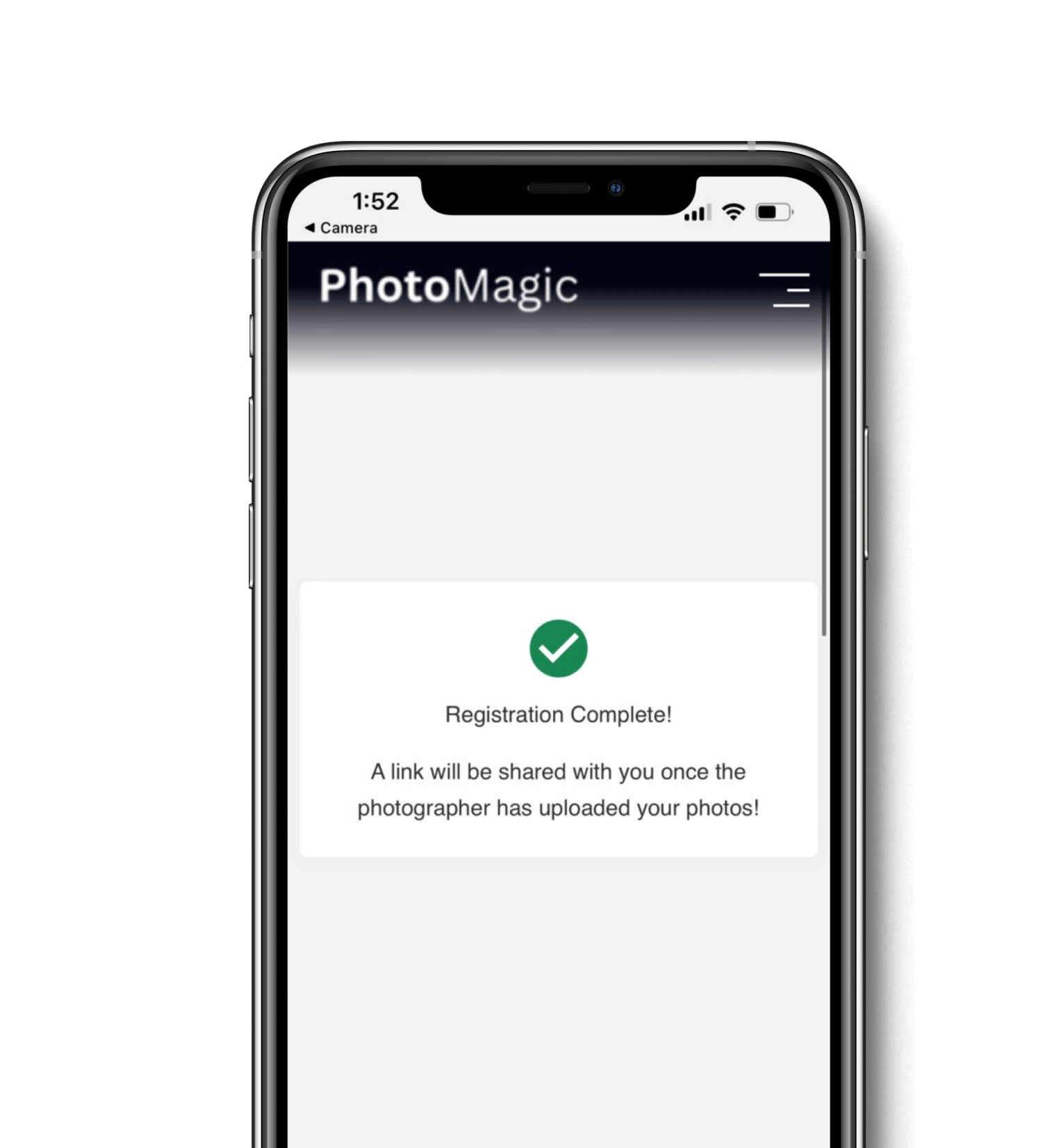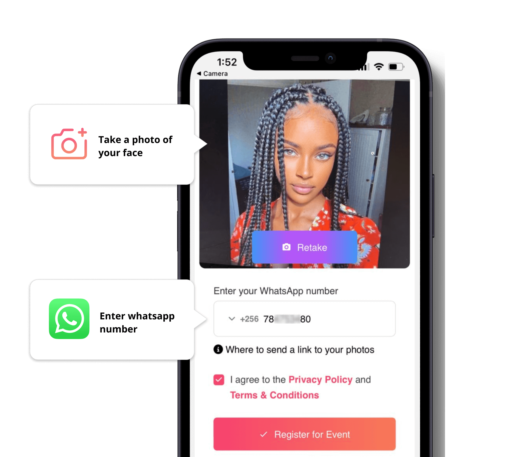 Upon event creation, a QR code, a link and an event alphanumeric code (e.g. PM0098) will be generated for sharing for event registration.